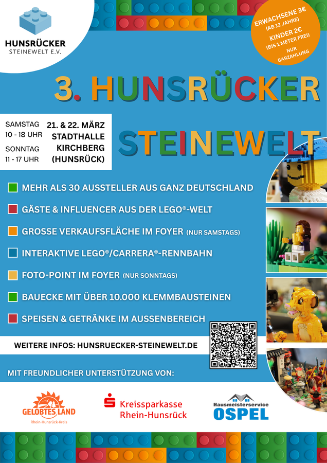 Bereits zum 3. Mal veranstaltet der Lego-Verein Hunsrücker Steinewelt e.V. seine große Ausstellung. Diesmal in der Stadthalle Kirchberg mit noch mehr Ausstellern, mehr Programm und mehr bunten Steinen!