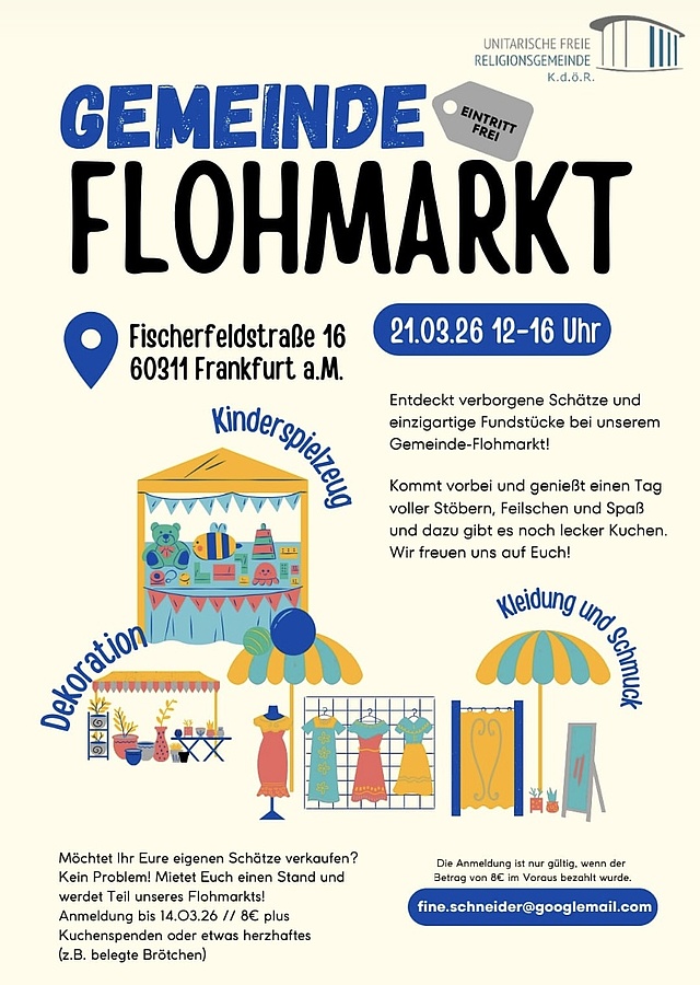 Am 21.03.2026 von 12–16 Uhr findet ein Gemeindeflohmarkt in der Unitarischen Gemeinde Frankfurt, Fischerfeldstraße 16, statt.
