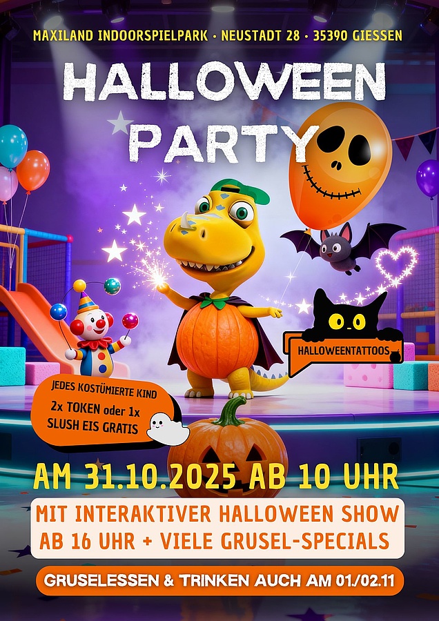 Am 31. Oktober findet im Indoorspielplatz Maxiland eine besondere Halloween-Mitmach-Show unter dem Motto „Magie, Lachen & Mitmachen“ statt. Die Besucher erwartet eine bunte Mischung aus Clownshow, Jonglage, verblüffenden Illusionen und vielen Mitmachmomenten, die Groß und Klein zum Staunen bringen. Zusätzlich gibt es coole Halloween-Tattoos für alle kleinen Gäste. Der Showstart ist um 16:00 Uhr, der Eintritt ist im regulären Ticketpreis enthalten.