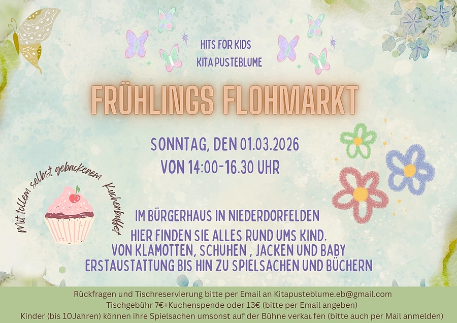 Flohmarkt "Hits for Kids" der Kita Pusteblume. Am 01.03. von 14:00-16:30 im Bürgerhaus Niederdorfelden.