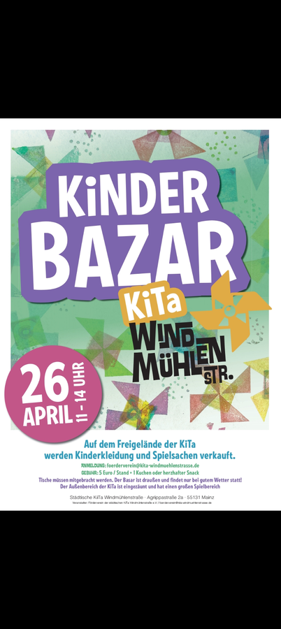 Der Basar findet nur bei trockenem Wetter statt. Tische müssen selbst mitgebracht werden. Der Außenbereich der Kita ist eingezäunt und hat einen Spielplatz, sowie ein Buffet.