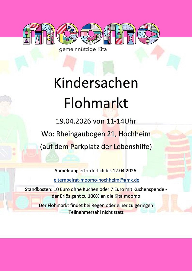 Der Elternbeirat der gemeinnützigen Kita Moomo in Hochheim veranstaltet einen Kindersachen Flohmarkt am 19.4.26 von 11-14 Uhr.