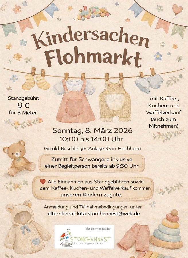 Am *Sonntag, den 8. März 2026*, findet wieder der Kindersachen-Flohmarkt in der Kita Storchennest statt!