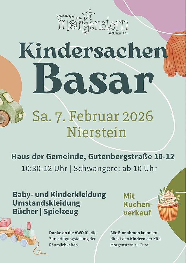 Am Samstag, 07.02.2026, lädt der Förderverein Kita Morgenstern Nierstein zum Kindersachen Basar ins Haus der Gemeinde (Gutenbergstraße 10–12) in Nierstein ein. Von 10:30 bis 12:00 Uhr kann nach Baby- und Kinderkleidung, Umstandskleidung, Büchern und Spielzeug gestöbert werden; Schwangere dürfen bereits ab 10:00 Uhr hinein. Für eine gemütliche Pause gibt es außerdem Kuchenverkauf. Alle Einnahmen kommen direkt den Kindern der Kita Morgenstern zugute – ein Besuch lohnt sich also doppelt: Schnäppchen machen und gleichzeitig Gutes tun.
