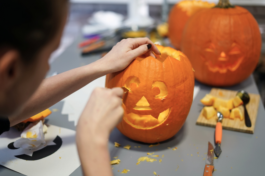 Ob mit scharfen Zähnen, geheimnisvollem Blick oder lustiger Grimasse – verleiht eurem Kürbis ein ganz eigenes Gesicht.