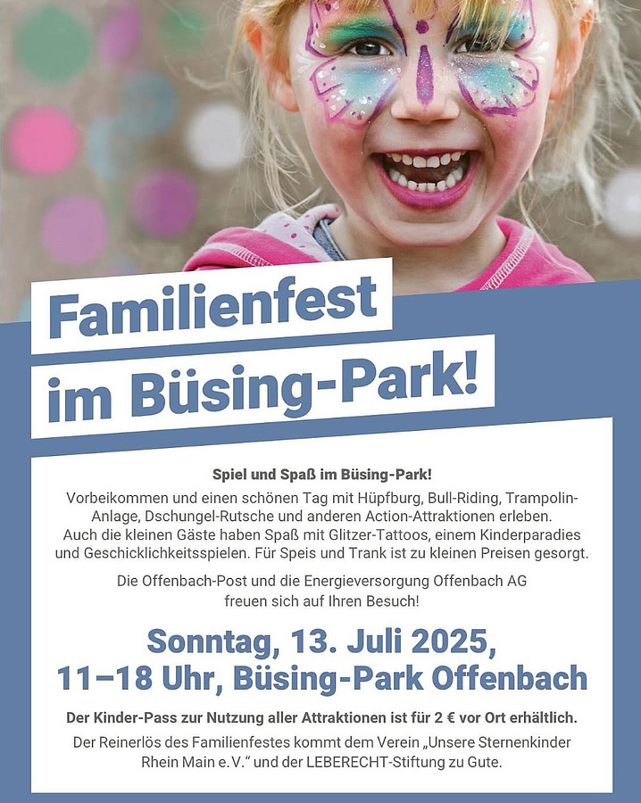 Nach dem großen Erfolg im letzten Jahr laden die Energieversorgung Offenbach AG (EVO) und die Offenbach-Post auch in diesem Sommer wieder zu einem großen Familienfest ein. Unterstützt wird das Fest von der Stadt Offenbach. Es findet am Sonntag, 13. Juli 2025, von 11 bis 18 Uhr im Büsing-Park statt.
