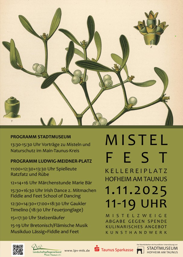 Dieses Jahr nehmen wir das zum Anlass, unser 2. MISTELFEST in Hofheim am Taunus zu feiern. Ende Oktober wird geschnitten, zwei Tage später, am 1.11. bieten wir Mistelzweige vor dem Stadtmuseum gegen eine Spende an.