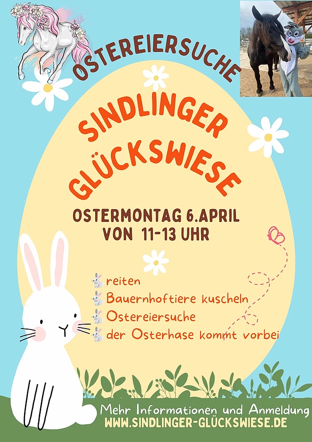 Die Ostereiersuche auf der Sindlinger Glückswiese findet am Ostermontag, 6. April, von 11 bis 13 Uhr statt. Kinder erwartet ein fröhliches Ostererlebnis mit Reiten, Bauernhoftiere kuscheln, Ostereiersuche und einem Besuch vom Osterhasen. Mehr Informationen und Anmeldung unter: sindlinger-glueckswiese.de