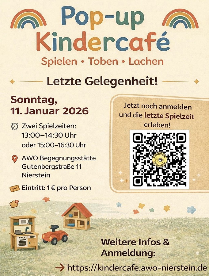 Am Sonntag, den 11. Januar 2026, öffnet das Pop-up Kindercafé der AWO Nierstein ein letztes Mal für diese Wintersaison.