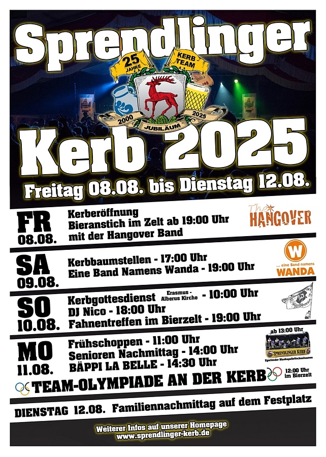 Die 309. Sprendlinger Kerb findet von Freitag, 8. August, bis Dienstag, 12. August 2025, täglich auf dem Kerbplatz, im Festzelt und in den umliegenden Heckenwirtschaften statt.