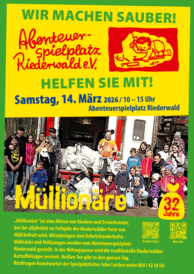 Der Abenteuerspielplatz Riederwald veranstaltet einen "Müllionärstag". Das Ziel dieses Events ist es, gemeinsam mit den Kindern den Wald von Müll zu befreien und alle Naturfreunde zum Frühjahrsputz im Wald einzuladen. Bitte Arbeitshandschuhe mitbringen. Müllsäcke und Müllzangen werden vom Abenteuerspielplatz bereitgestellt.