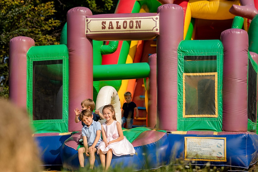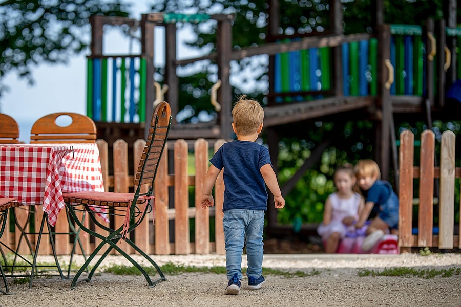 Ein besonderes Highlight ist die liebevoll gestaltete Kinderwelt, die vor allem an Wochenenden bei gutem Wetter ein abwechslungsreiches Erlebnis für Kinder bietet. Hier können sich die Kleinen auf einer Hüpfburg austoben, mit Ponycycle-Spielpferden spielen oder den großen Spielplatz entdecken. Auch sportliche Aktivitäten wie Fußball, Federball oder eine Runde Boule sorgen für Spaß im Freien.