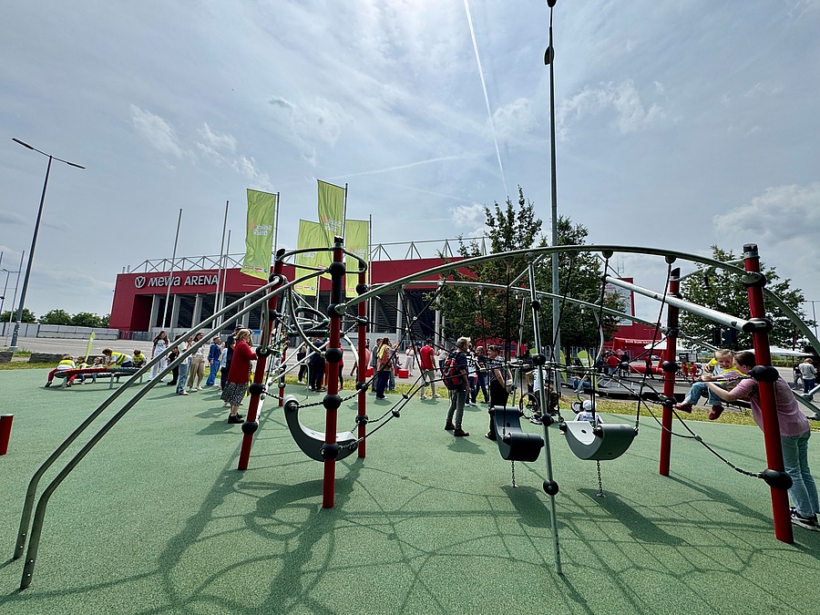 Der neue inklusive Spielplatz nahe dem Stadion von Mainz 05 bietet Rampen statt Treppen, breite Wege und barrierefreie Spielgeräte, sodass alle Kinder – mit und ohne Behinderung – gemeinsam spielen können.